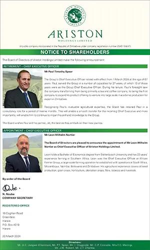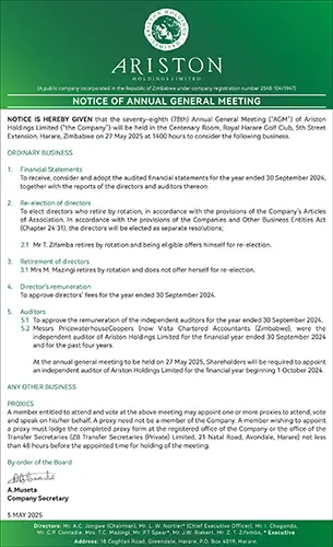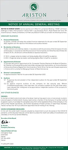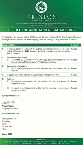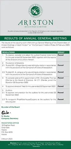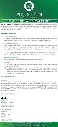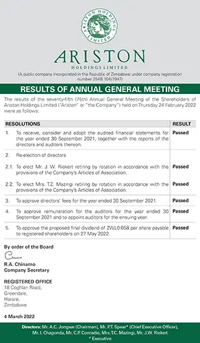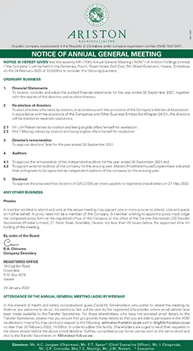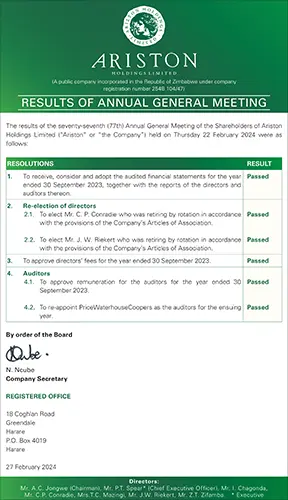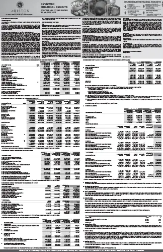 Annual Reports View our past and current annual reports and other public notices. Annual Reports AGM Reports Other Reports Ariston Annual Report 2024 Ariston Annual Report 2023 Ariston Annual Report 2022 Ariston Annual Report 2021 Annual Report 2020 Preliminary Results 2020 Annual Report 2019 Preliminary Results 2019 Annual Report 2016 Ariston Results of 78th Annual General Meeting 2025 Ariston Notice of 78th AGM 2024 Ariston Results of 77th Annual General Meeting 2024 Ariston Notice of 77th AGM 2023 Ariston Notice of 76th Annual General Meeting 2022 Ariston Results of 76th Annual General Meeting 2023 Ariston Notice of 75th Annual General Meeting 2021 Ariston Results of 75th Annual General Meeting 2022 Ariston Notice of CEO Retirement And New Appointment