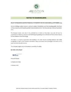 Annual Reports View our past and current annual reports and other public notices. Annual Reports AGM Reports Other Reports Ariston Annual Report 2024 Ariston Annual Report 2023 Ariston Annual Report 2022 Ariston Annual Report 2021 Annual Report 2020 Preliminary Results 2020 Annual Report 2019 Preliminary Results 2019 Annual Report 2016 Ariston Results of 78th Annual General Meeting 2025 Ariston Notice of 78th AGM 2024 Ariston Results of 77th Annual General Meeting 2024 Ariston Notice of 77th AGM 2023 Ariston Notice of 76th Annual General Meeting 2022 Ariston Results of 76th Annual General Meeting 2023 Ariston Notice of 75th Annual General Meeting 2021 Ariston Results of 75th Annual General Meeting 2022 Ariston Notice of CEO Retirement And New Appointment Ariston Holdings January 2026 Directorate changes Ariston Holdings 2025 Financial Statements deadline extension